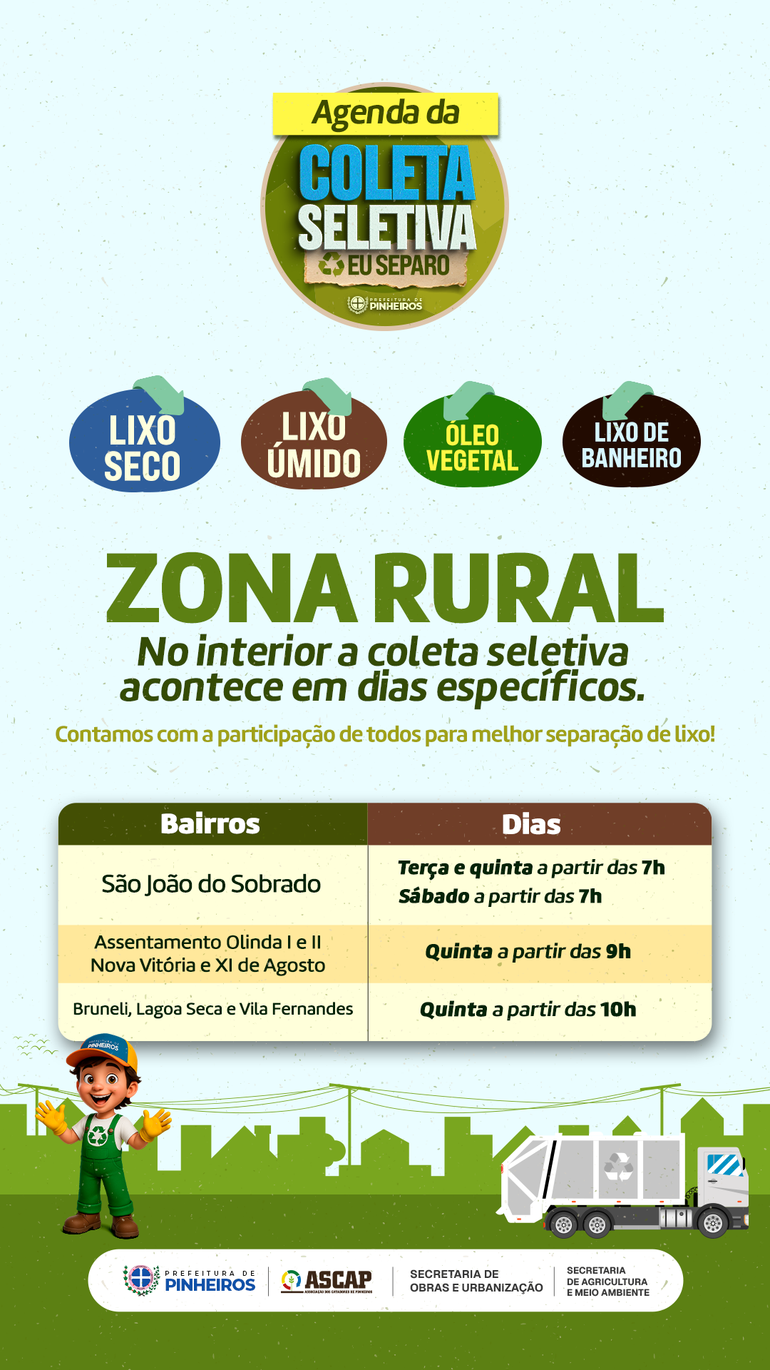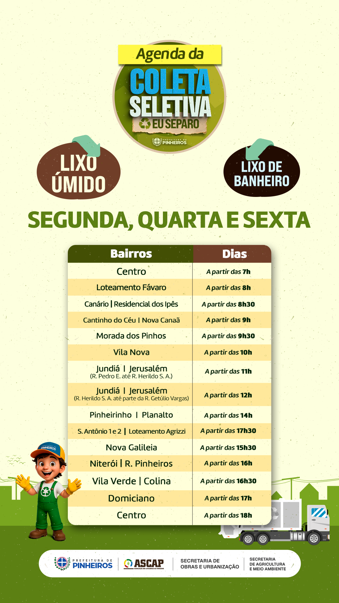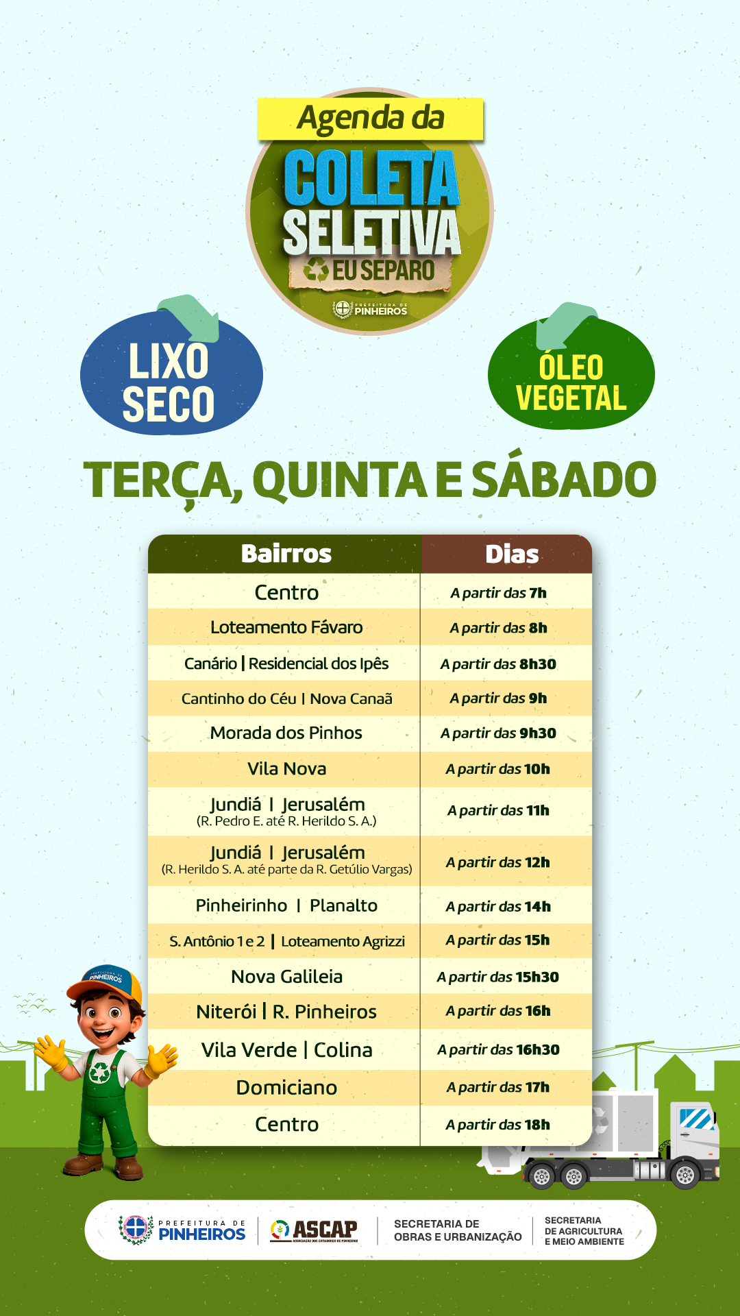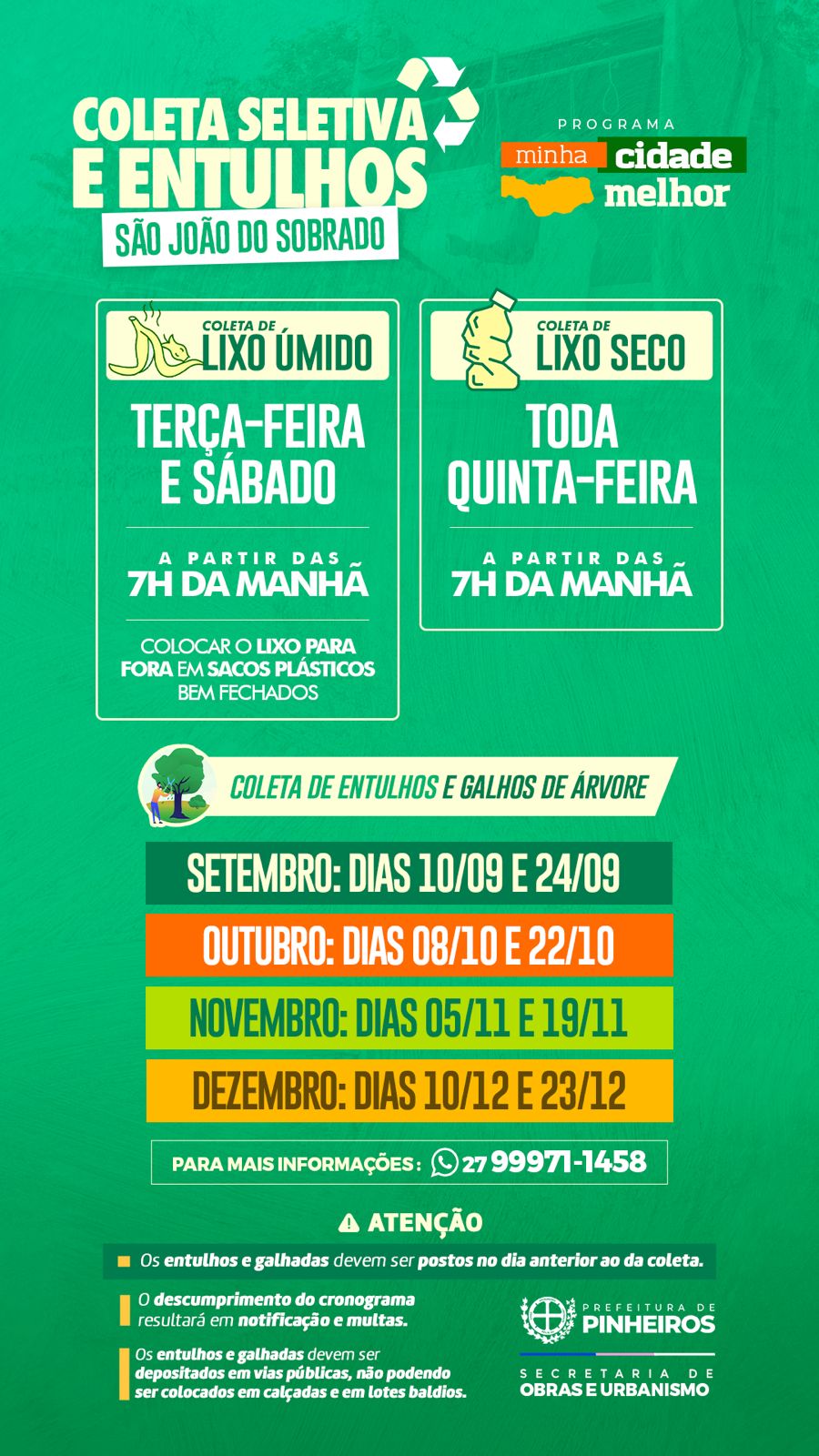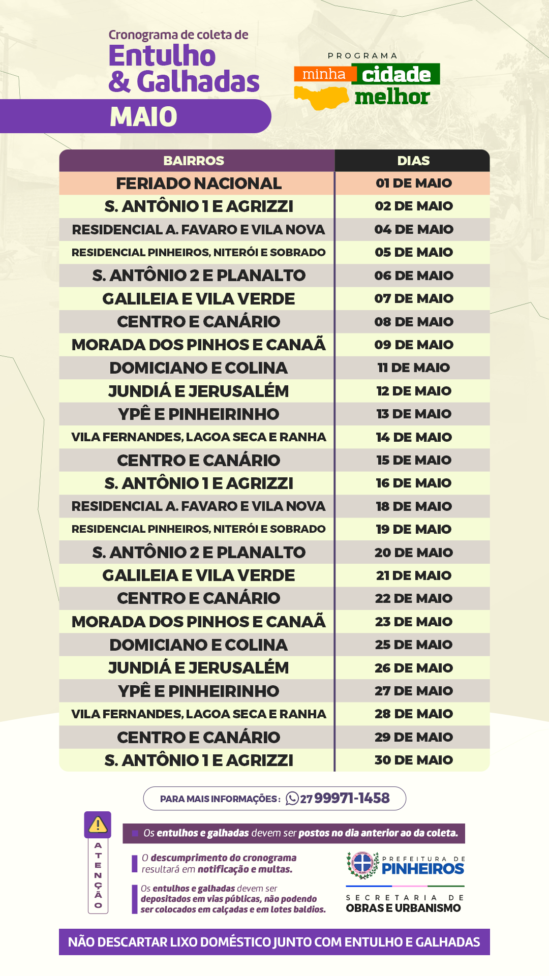 - A Prefeitura de Pinheiros, por meio da Secretaria de Obras e Urbanismo, anunciou um novo cronograma para a coleta de entulho e folhagem e da coleta seletiva no município.