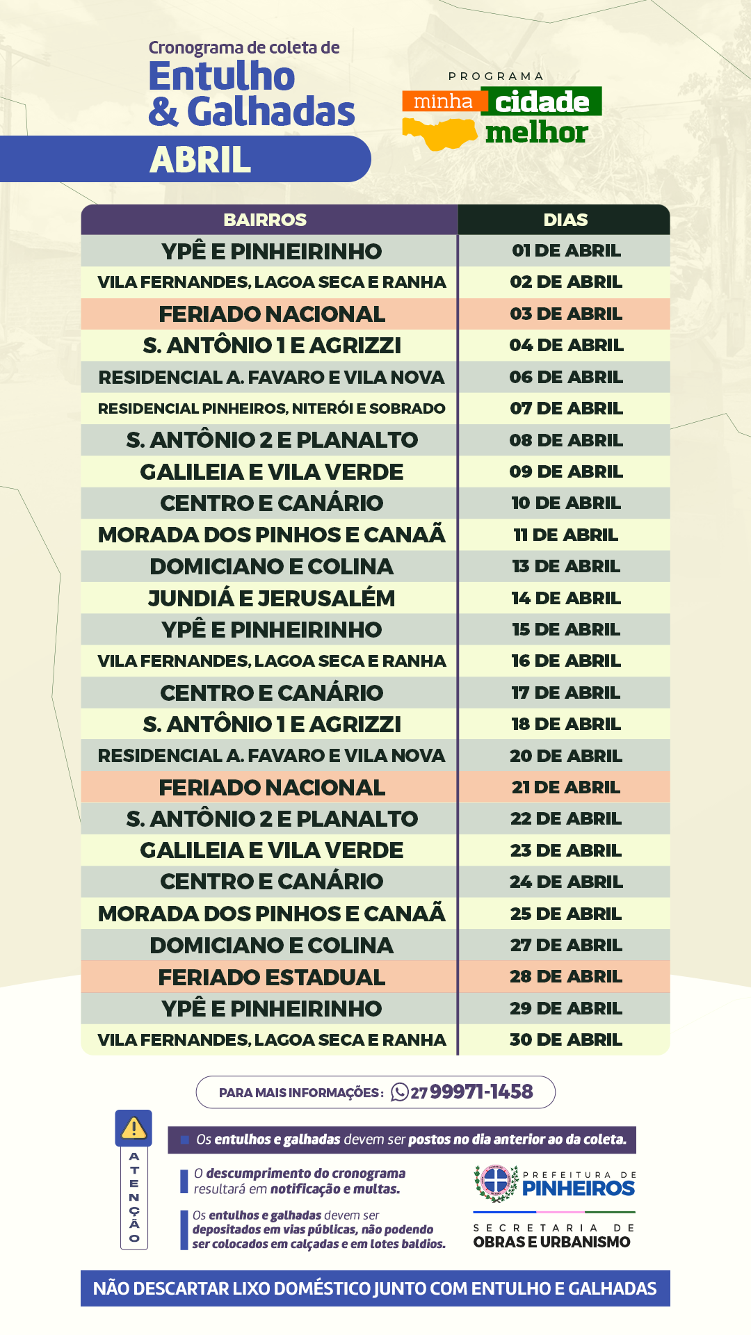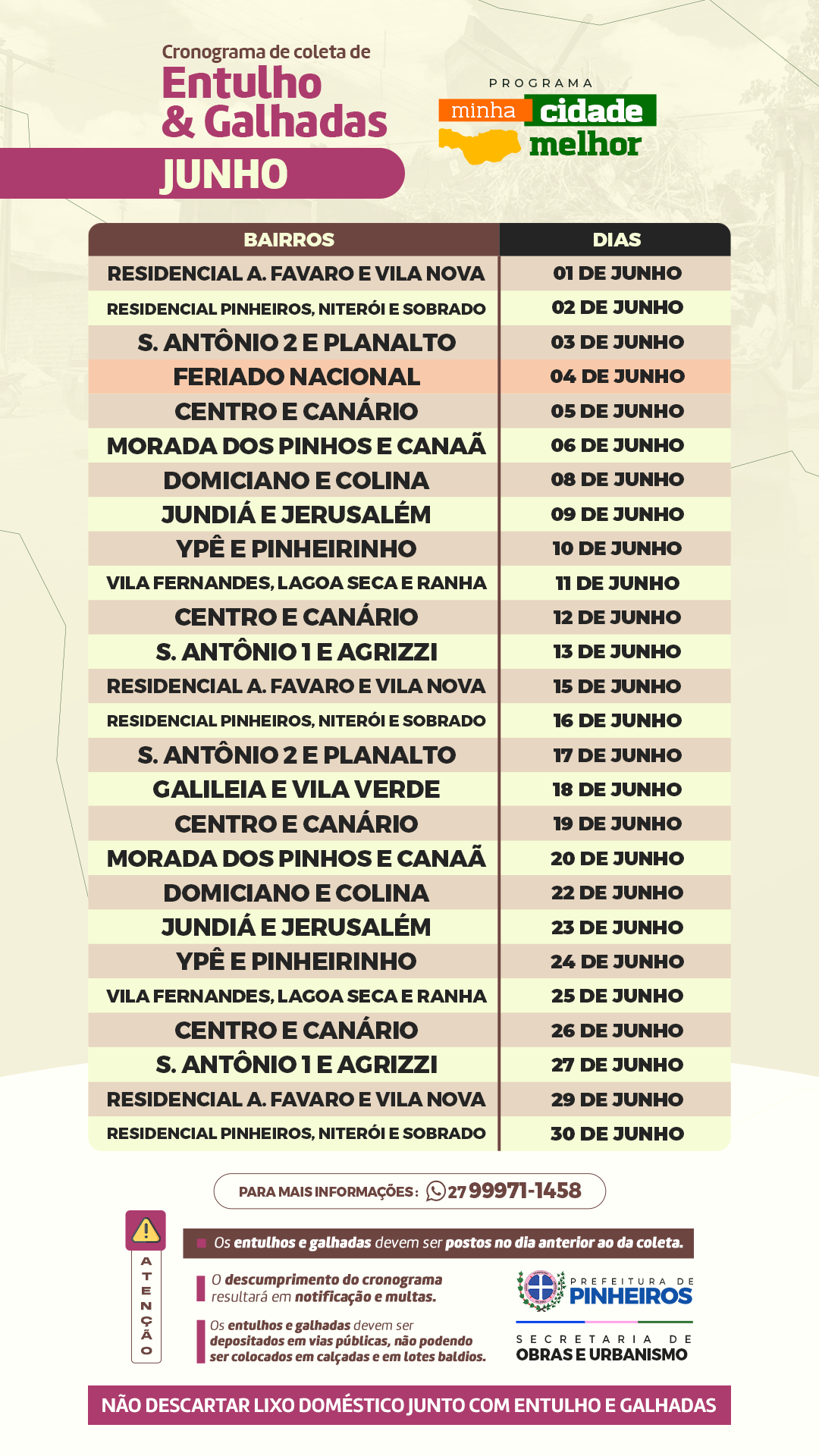 - A administração municipal reforça a importância da participação da população, tanto no cumprimento das datas de descarte quanto na divulgação das informações. Dúvidas ou mais detalhes podem ser obtidos pelo telefone (27) 99971-1458.