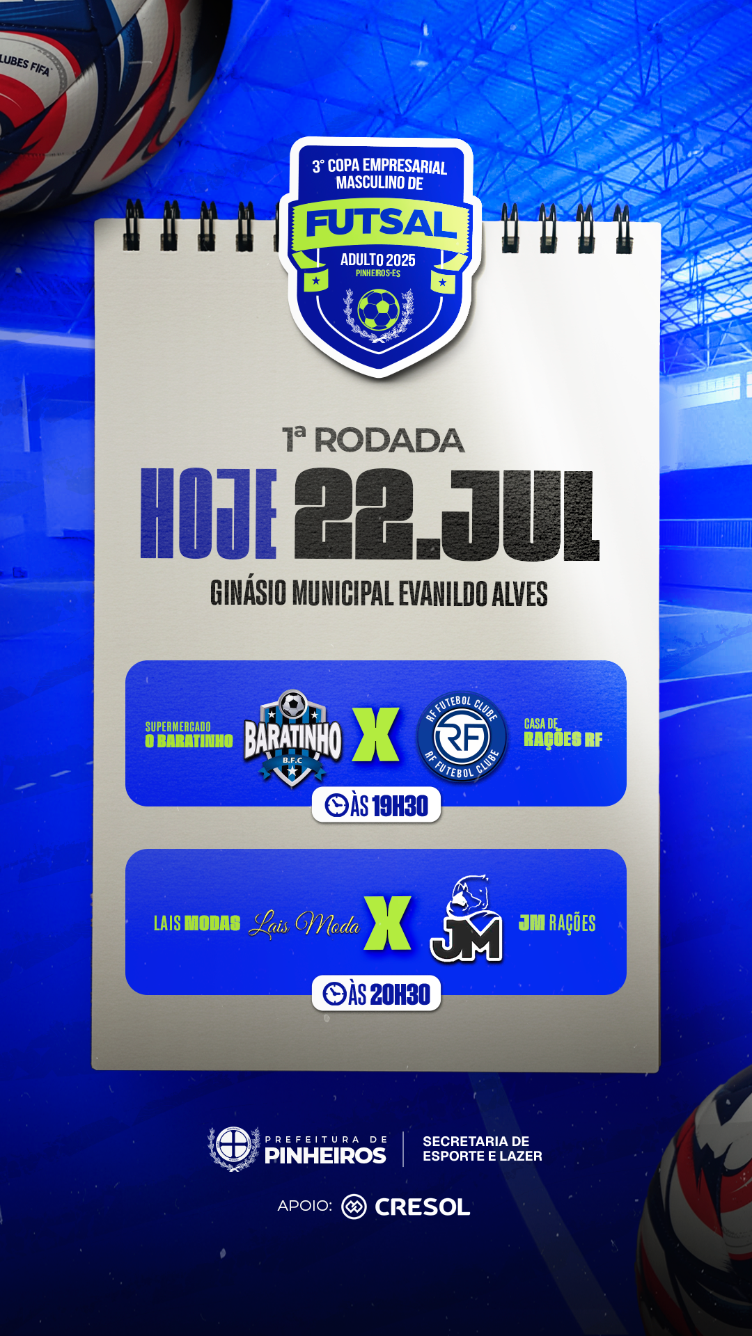 - A 3ª edição da Copa Empresarial de Futsal tem início nesta terça-feira (22), no Ginásio Municipal. A rodada de abertura começa às 19h30, com o confronto entre Supermercado Baratinho e Casa de Rações RF. Em seguida, entram em quadra Laís Modas e JM Rações.