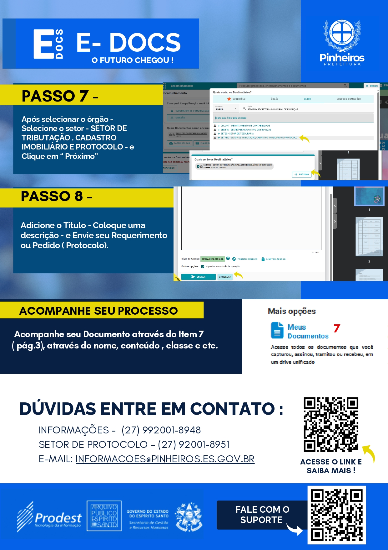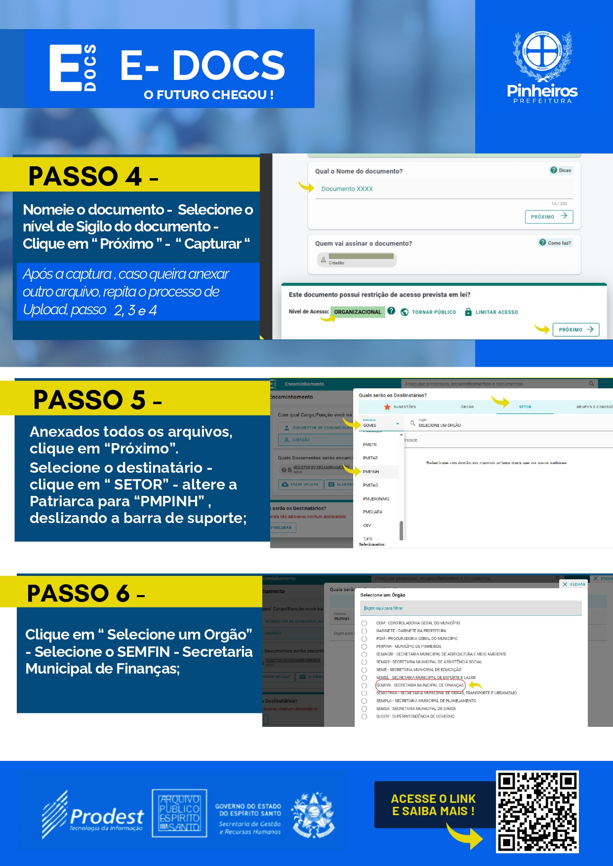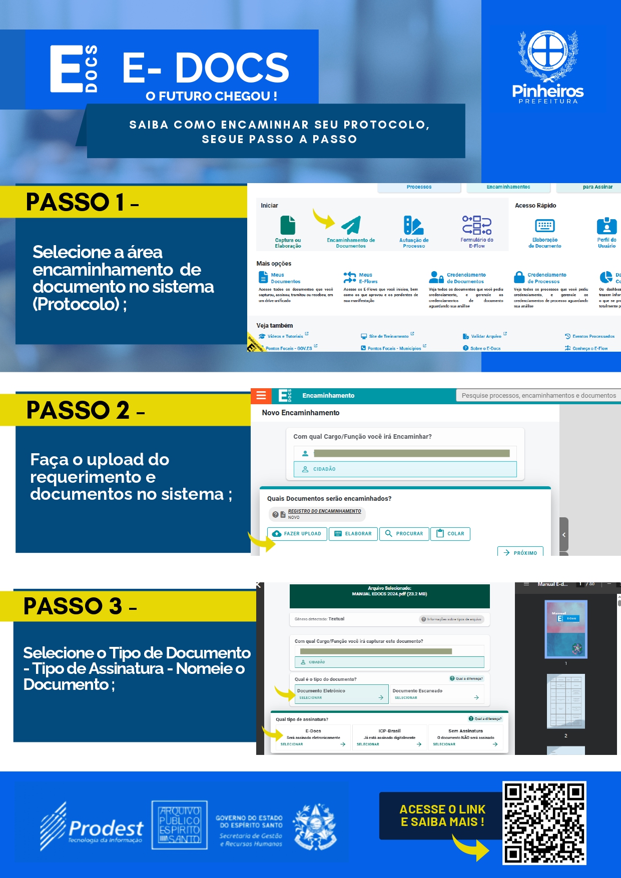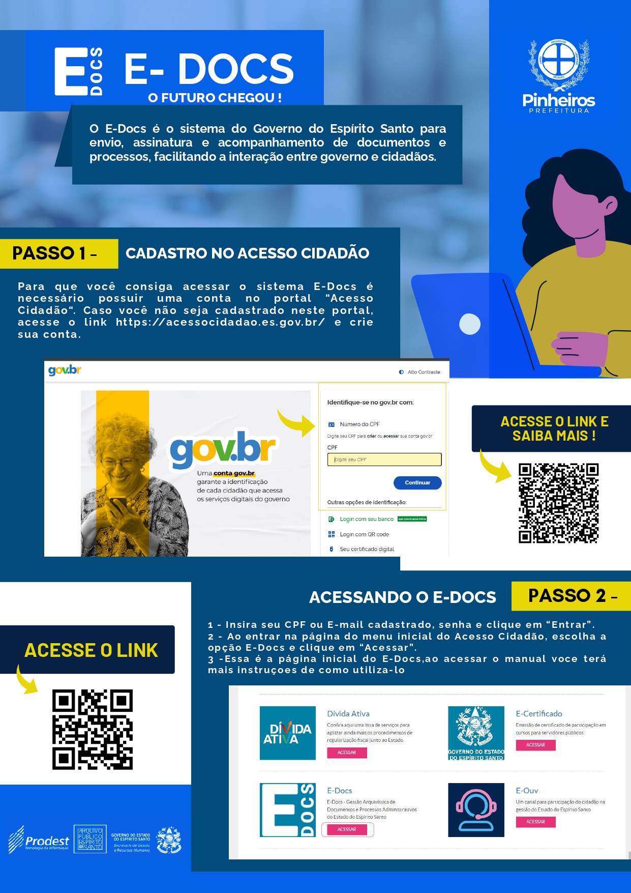- O E-Docs pode ser acessado pelo link https://edocs.es.gov.br. Um tutorial completo está disponível em https://shre.ink/thut.