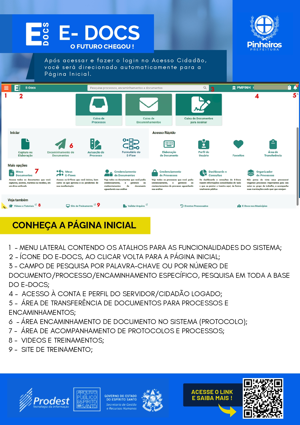 - Já está disponível em Pinheiros o novo site do Sistema de Gestão de Documentos Arquivísticos Eletrônicos do Governo do Estado (E-Docs). A plataforma – que possui visual renovado, integração de tecnologias, centralização de informações e navegação intuitiva –, oferece mais praticidade no acesso aos serviços digitais.