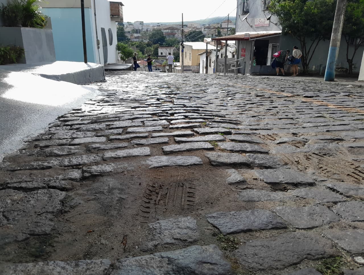 - A via, calçada há décadas com paralelepípedos, apresenta hoje trechos desnivelados, buracos e irregularidades em terreno íngreme, comprometendo a mobilidade e aumentando o risco de acidentes para motoristas e pedestres.