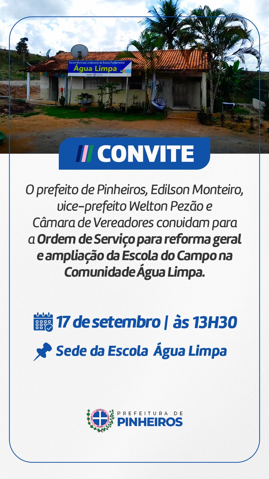 - A Escola Água Limpa passa a integrar o conjunto de unidades em processo de reforma no município, ao lado das escolas Augusto Ruschi, Vila Nova, Juracy Cardoso Viana e Santa Rita, além da construção de uma nova quadra poliesportiva na Escola Brunelli.