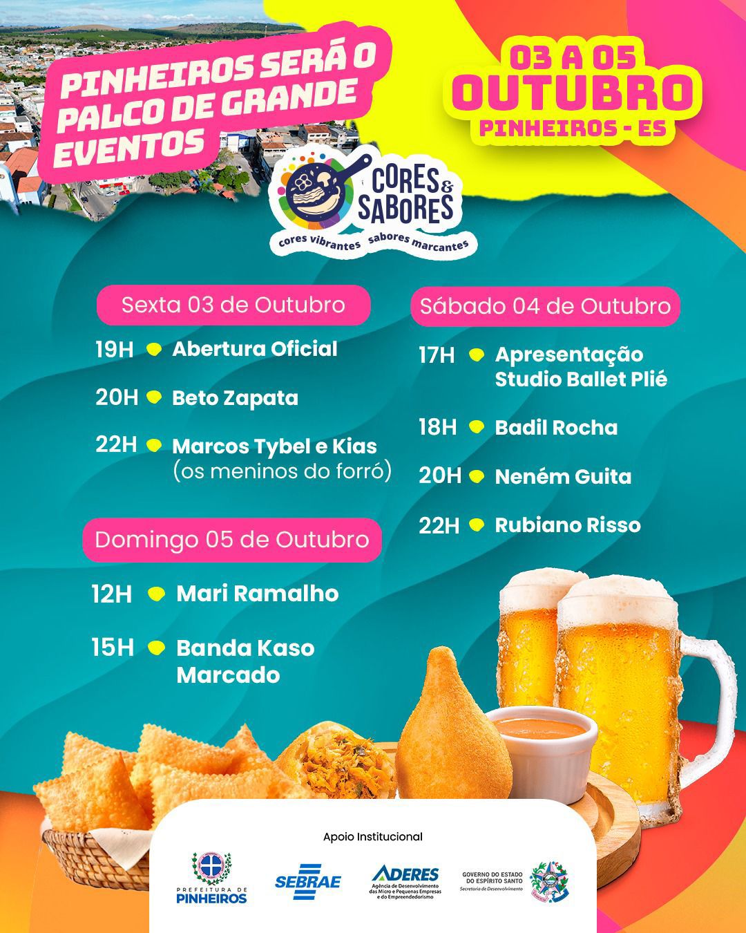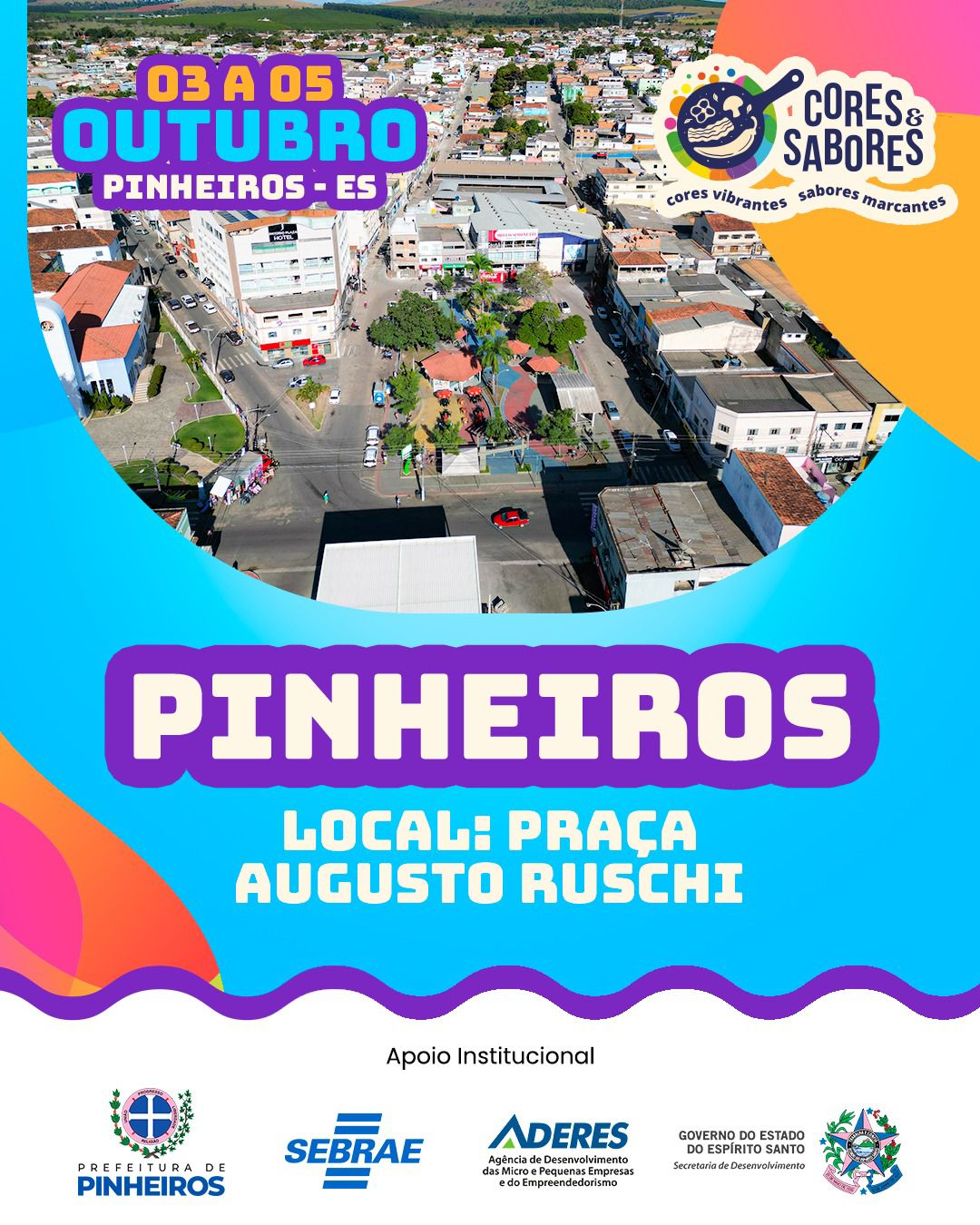 - A Prefeitura de Pinheiros divulgou, nesta segunda-feira (29), a programação da Feira Cores & Sabores Edição Pinheiros. O evento, que acontece de 3 a 5 de outubro, na Praça Augusto Ruschi, bairro Santo Antônio, vai ter muita música, gastronomia e cultura.
