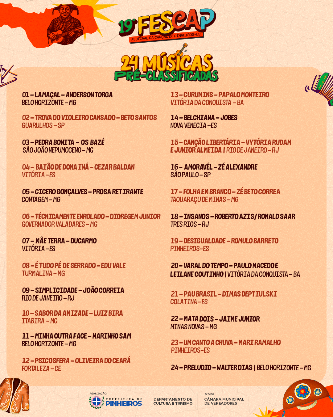 - O Departamento de Cultura e Turismo da Prefeitura de Pinheiros divulgou, nesta terça-feira (30), a relação de músicas pré-classificadas para o 19º Festival da Canção de Pinheiros (Fescap), que acontece nos dias 30 e 31 de outubro e 1º de novembro, na Praça Cristiano Dias Lopes, a tradicional “Praça do Posto”.