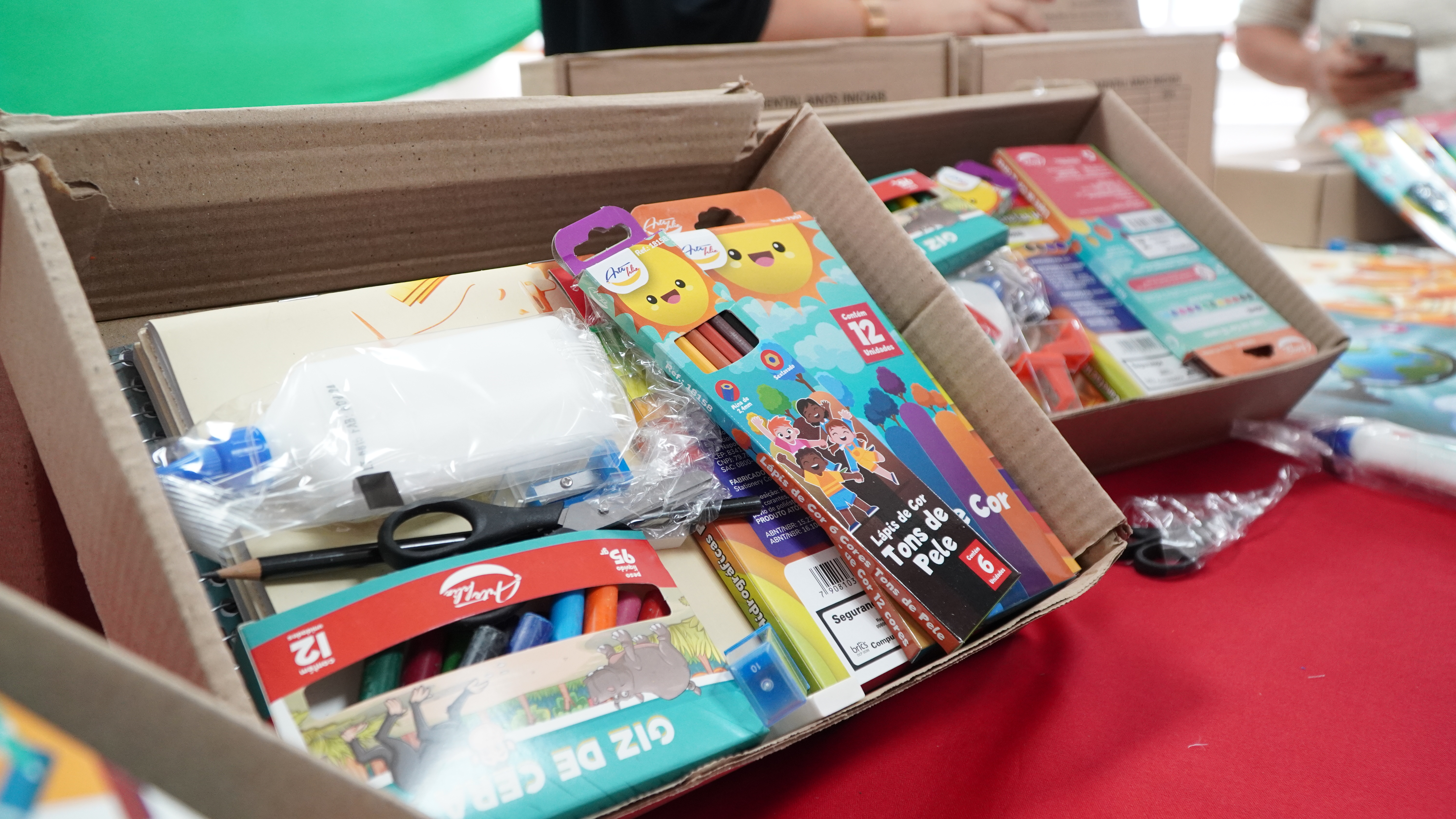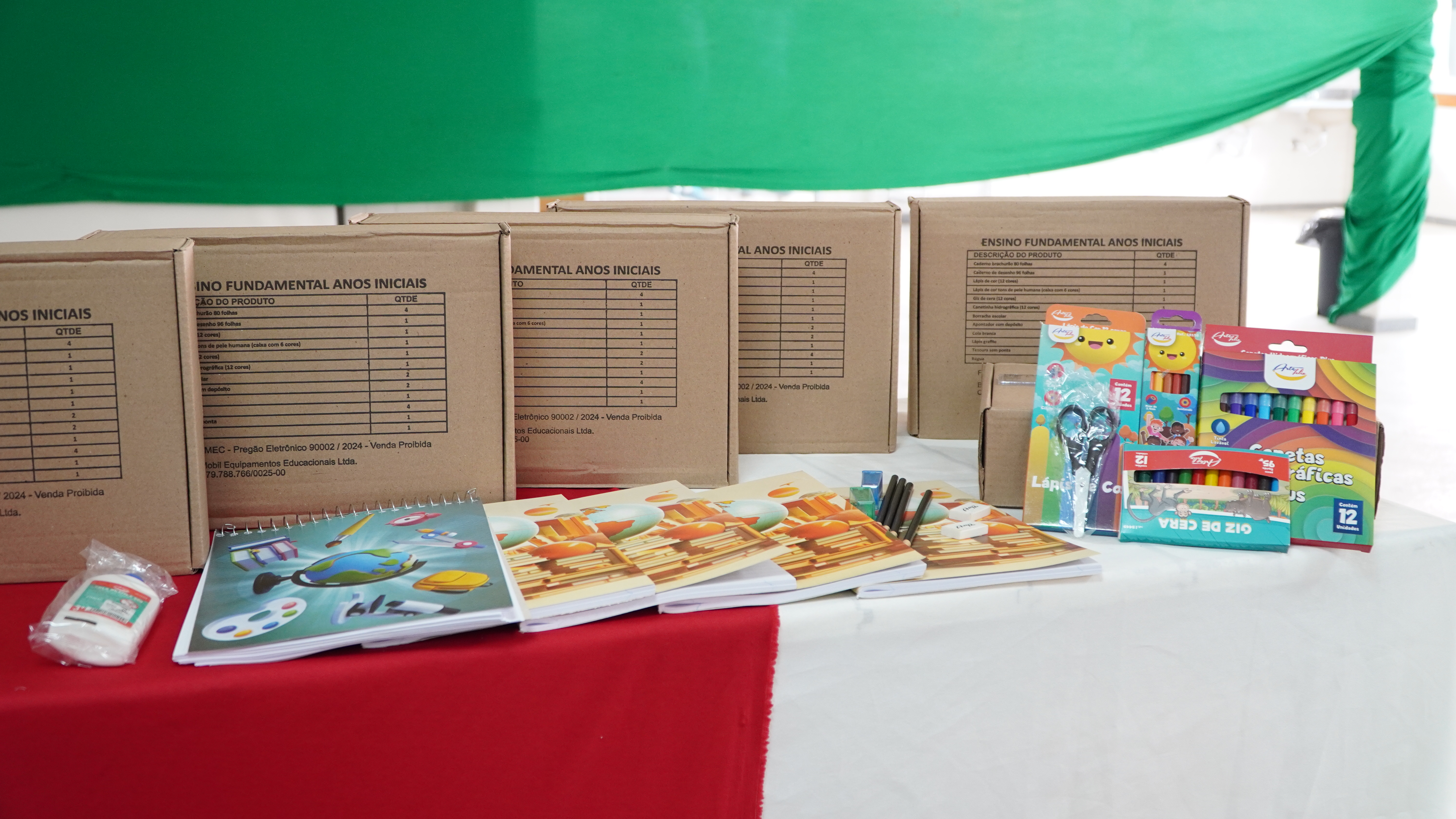 - Já os kits destinados ao Ensino Fundamental – Anos Iniciais incluem caderno brochurão (80 folhas), caderno de desenho (96 folhas), lápis grafite, lápis de cor (12 cores), lápis de cor em tons de pele humana (6 cores), giz de cera (12 cores), canetinhas hidrográficas (12 cores), borracha escolar, apontador com depósito, cola branca, tesoura sem ponta e régua.