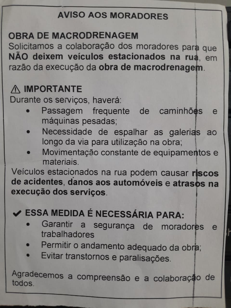 - Ainda segundo a orientação, veículos estacionados nas áreas de intervenção podem provocar acidentes, causar danos aos automóveis e comprometer o andamento dos trabalhos, gerando atrasos na execução do cronograma.
